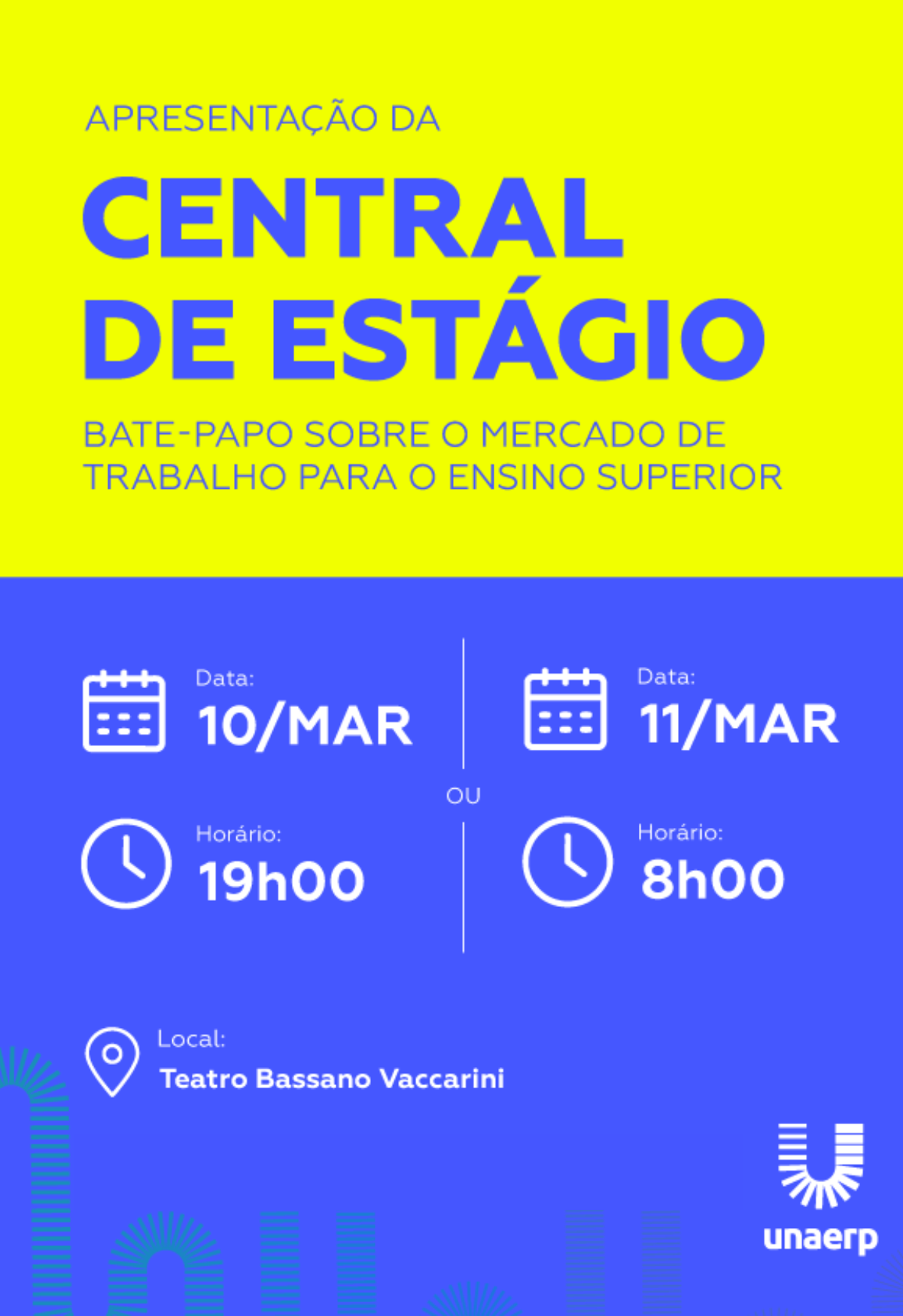 Central de Estágio promove palestra sobre mercado de trabalho no ensino superiorEvento, realizado em março, será conduzido pela coordenadora da Central, Nathalia Bonini, e Adriel Luis Gennaro, da Alpha Estágios