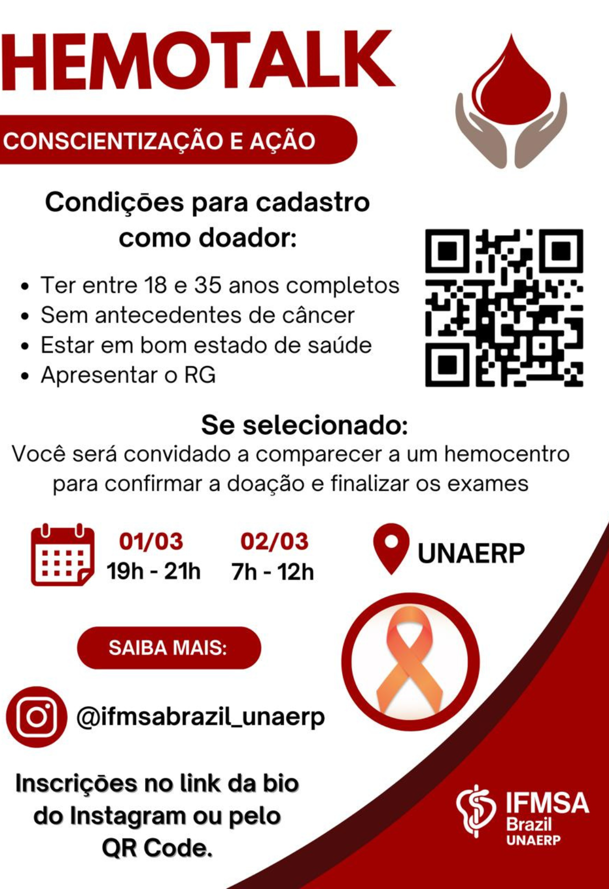 Em parceria com o Hemocentro, IFMSA Brazil Unaerp promove evento para cadastro de doadores de medula ósseaHemotalk será realizado nos dias 1 e 2 de março, na sala 29 do Bloco B
