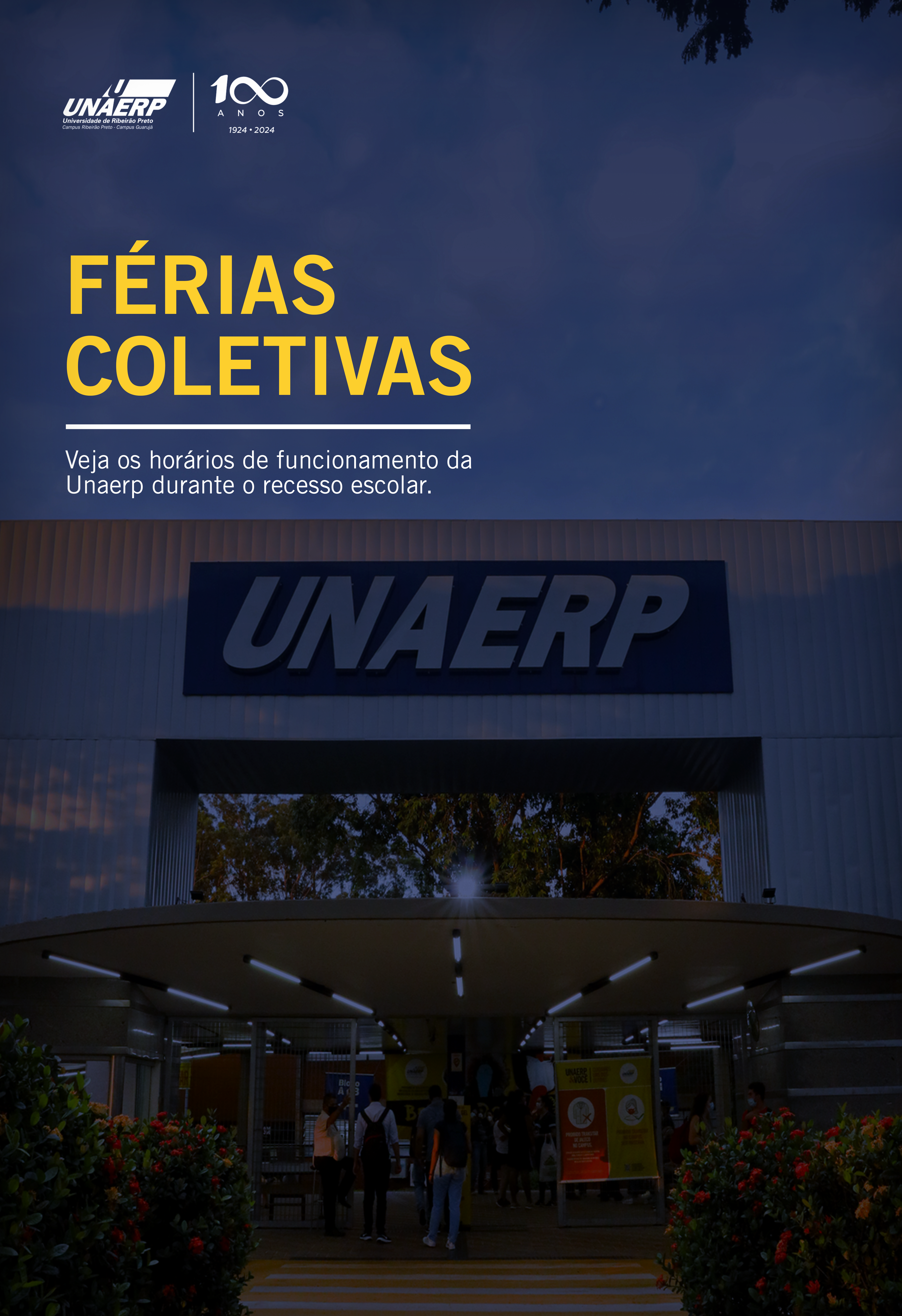 Confira os horários de funcionamento da Unaerp durante as fériasDe 22 de dezembro a 2 de janeiro, todos os setores da Instituição permanecerão fechados para atendimento, devido às férias coletivas